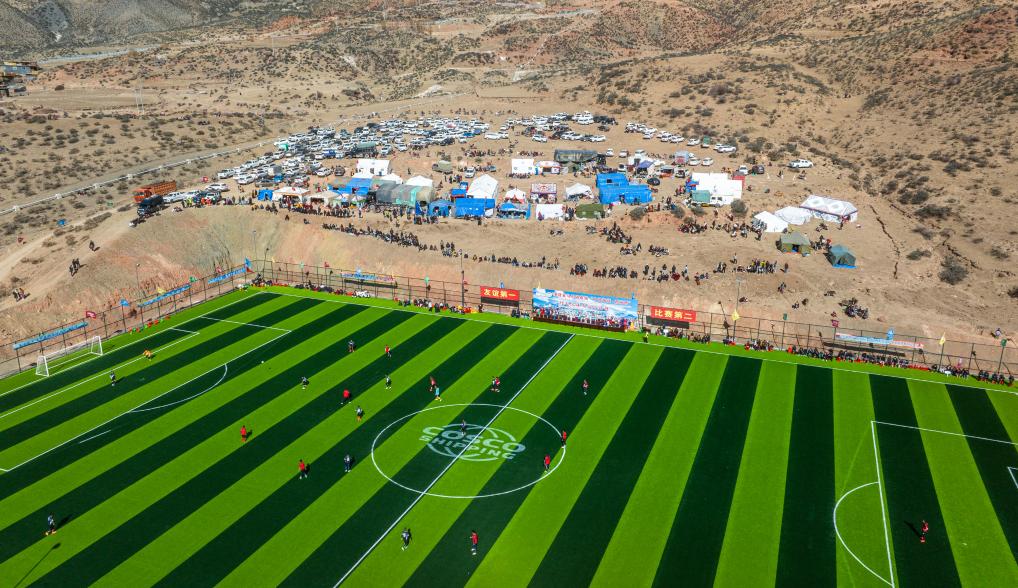 在馬利鎮(zhèn)“云中球場”,球員們正在比賽中(1月2日攝,無人機照片)。新華社記者 丁增尼達 攝