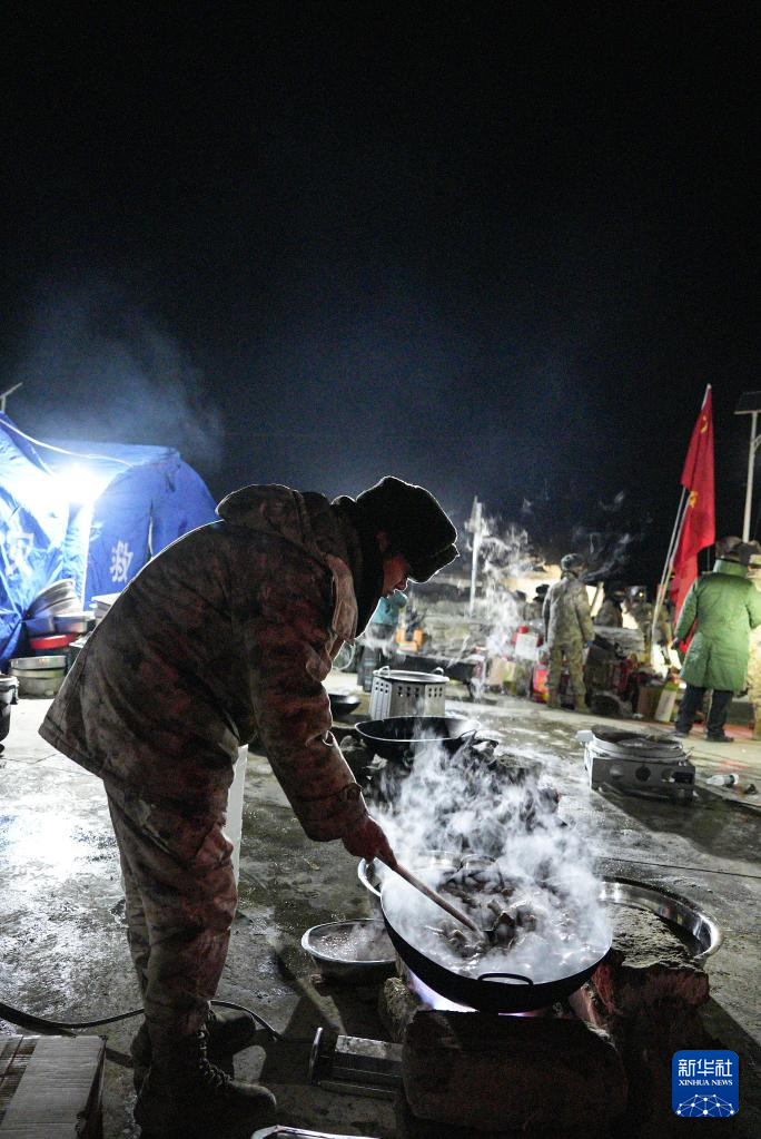 1月7日,在定日縣古榮村集中安置點(diǎn),解放軍為受災(zāi)群眾做飯。新華社記者 晉美多吉 攝