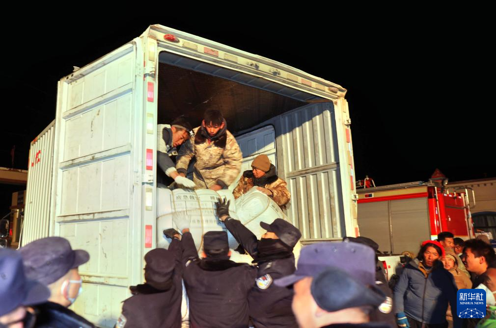 1月7日,救援人員在定日縣措果鄉(xiāng)裝運(yùn)救災(zāi)物資。新華社記者 姜帆 攝