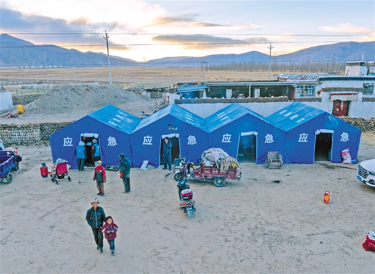 圖為1月7日,在拉孜縣曲下鎮(zhèn)土林村,受災(zāi)群眾搬入應(yīng)急帳篷(無(wú)人機(jī)照片)。新華社記者 姜帆 攝
