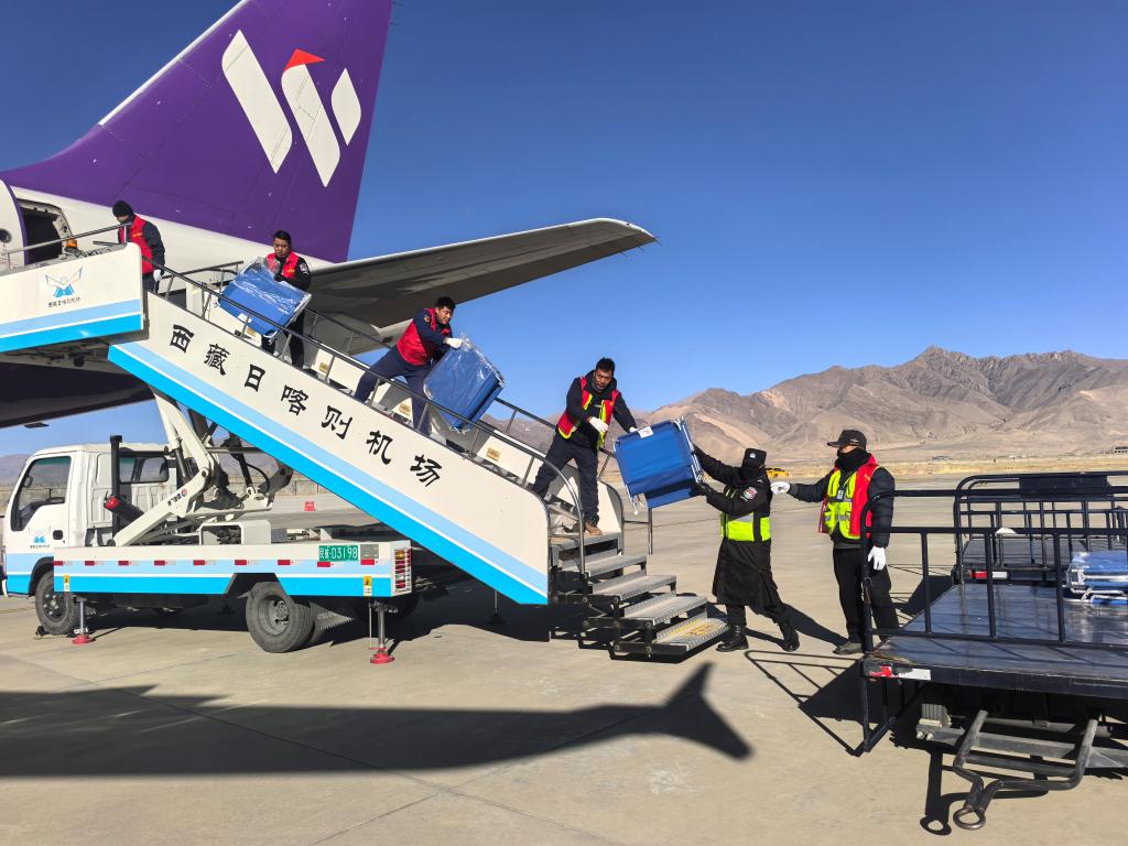 1月9日上午,救援物資抵達(dá)西藏日喀則機場。新華社發(fā)