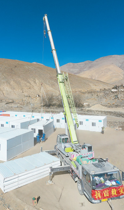 1月9日,在定日縣長所鄉(xiāng)古榮村安置點(diǎn),施工人員抓緊搭建移動(dòng)板房。人民網(wǎng)記者 翁奇羽攝