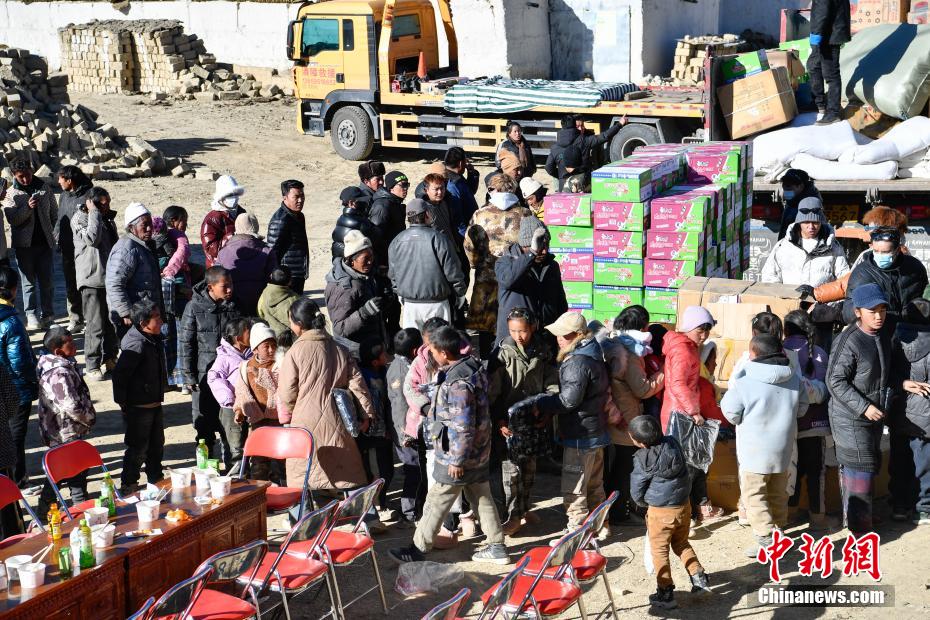 1月9日,西藏自治區(qū)定日縣曲洛鄉(xiāng)措昂村安置點,愛心企業(yè)為受災(zāi)民眾發(fā)放生活物資。當(dāng)日,位于西藏自治區(qū)定日縣曲洛鄉(xiāng)措昂村安置點,西藏各級救援人員和愛心企業(yè)不斷轉(zhuǎn)運(yùn)、發(fā)放生活物資、搭建安置活動板房、全力保障受災(zāi)民眾的飲食供應(yīng)等,保障受災(zāi)民眾基本生活。中新社記者 貢嘎來松 攝