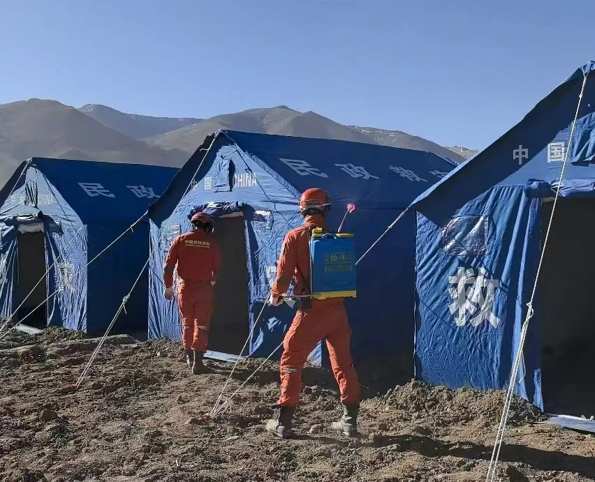 安置點人員密集,衛(wèi)生防疫至關重要,突擊隊在安置點和帳篷進行消殺作業(yè)。隨著夜幕降臨,氣溫驟降,突擊隊又開始為群眾搬運柴火物資、架上火爐。