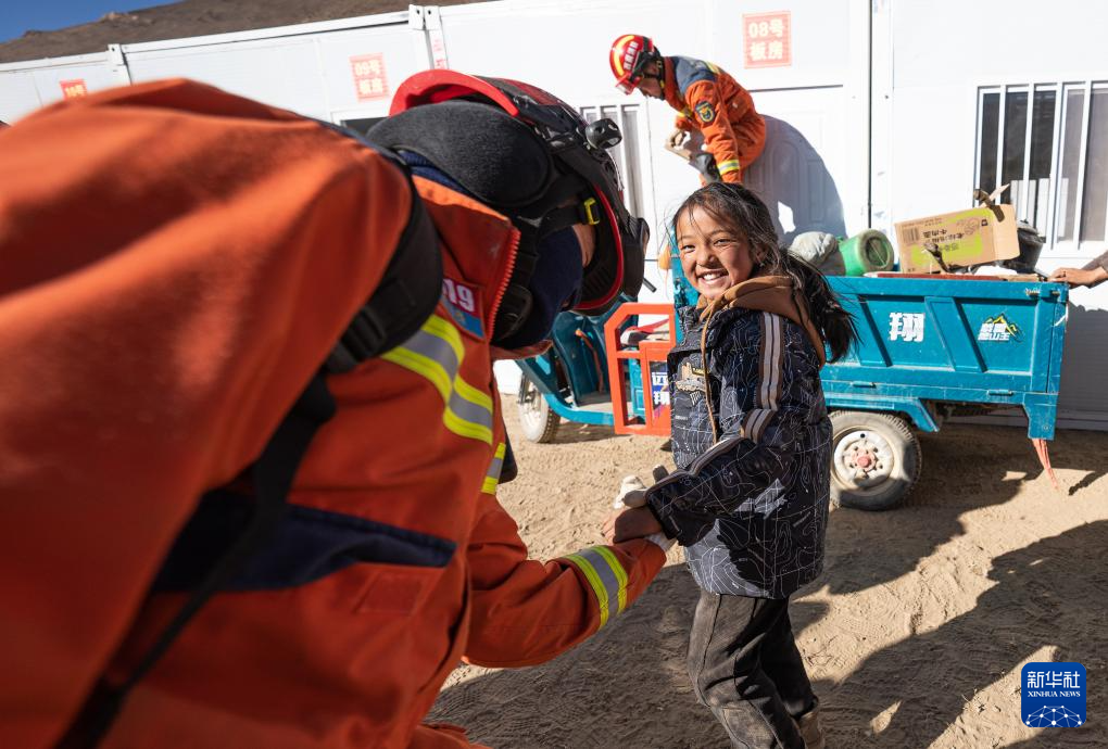 在定日縣措果鄉(xiāng)野江村,一個小女孩在和消防員掰手腕(1月13日攝)。新華社記者 丁增尼達 攝