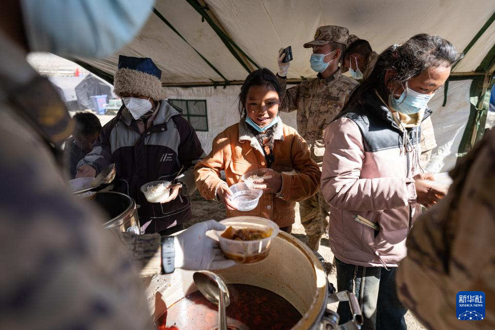在定日縣長所鄉(xiāng)森嘎村,群眾在排隊打飯(1月13日攝)。新華社記者 丁增尼達 攝