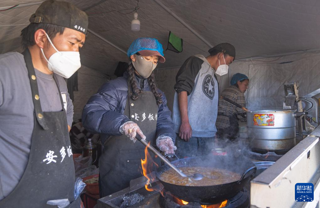 在定日縣長所鄉(xiāng)古榮村,定日安多飯館的廚師在為群眾做面片(1月13日攝)。新華社記者 丁增尼達 攝