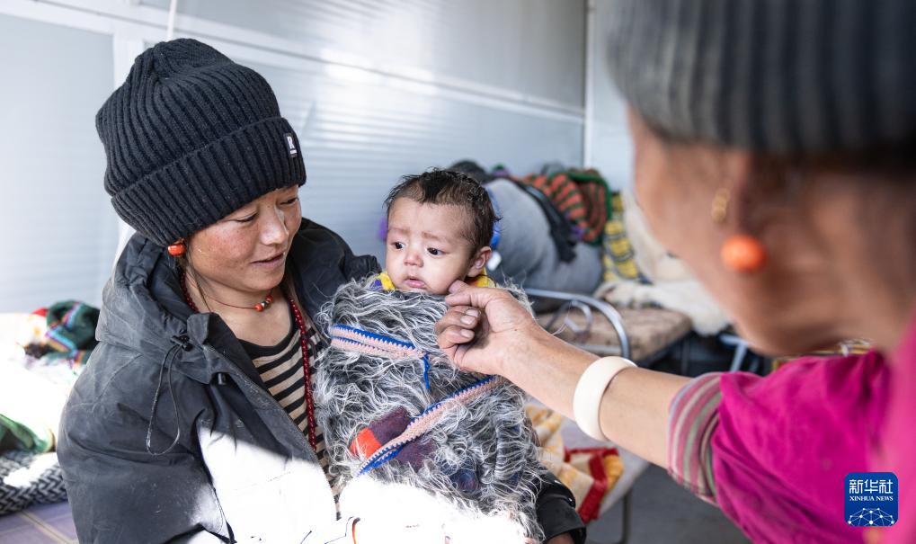 在定日縣長所鄉(xiāng)嘎旦村的活動板房里,一位老人在逗孫子開心(1月13日攝)。新華社記者 丁增尼達 攝