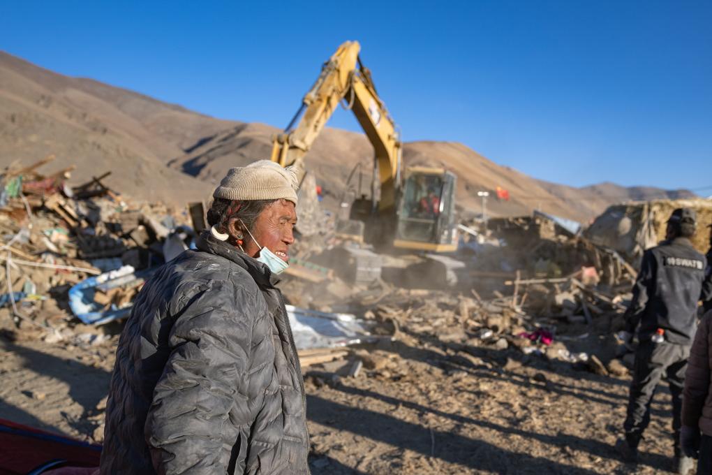 1月13日,在定日縣長所鄉(xiāng)古榮村,次仁扎西老人站在自家的廢墟前。新華社記者丁增尼達 攝
