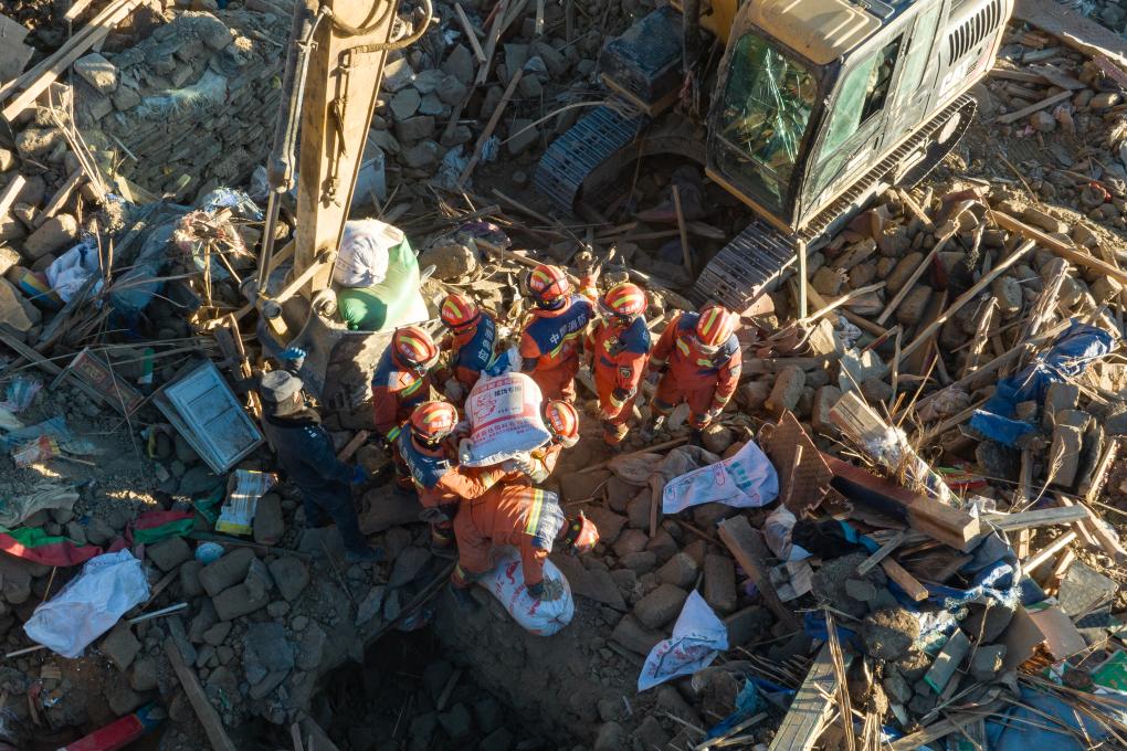 1月13日,在定日縣長所鄉(xiāng)古榮村,消防員們在搬運從廢墟中搶救出的青稞(無人機照片)。新華社記者丁增尼達 攝