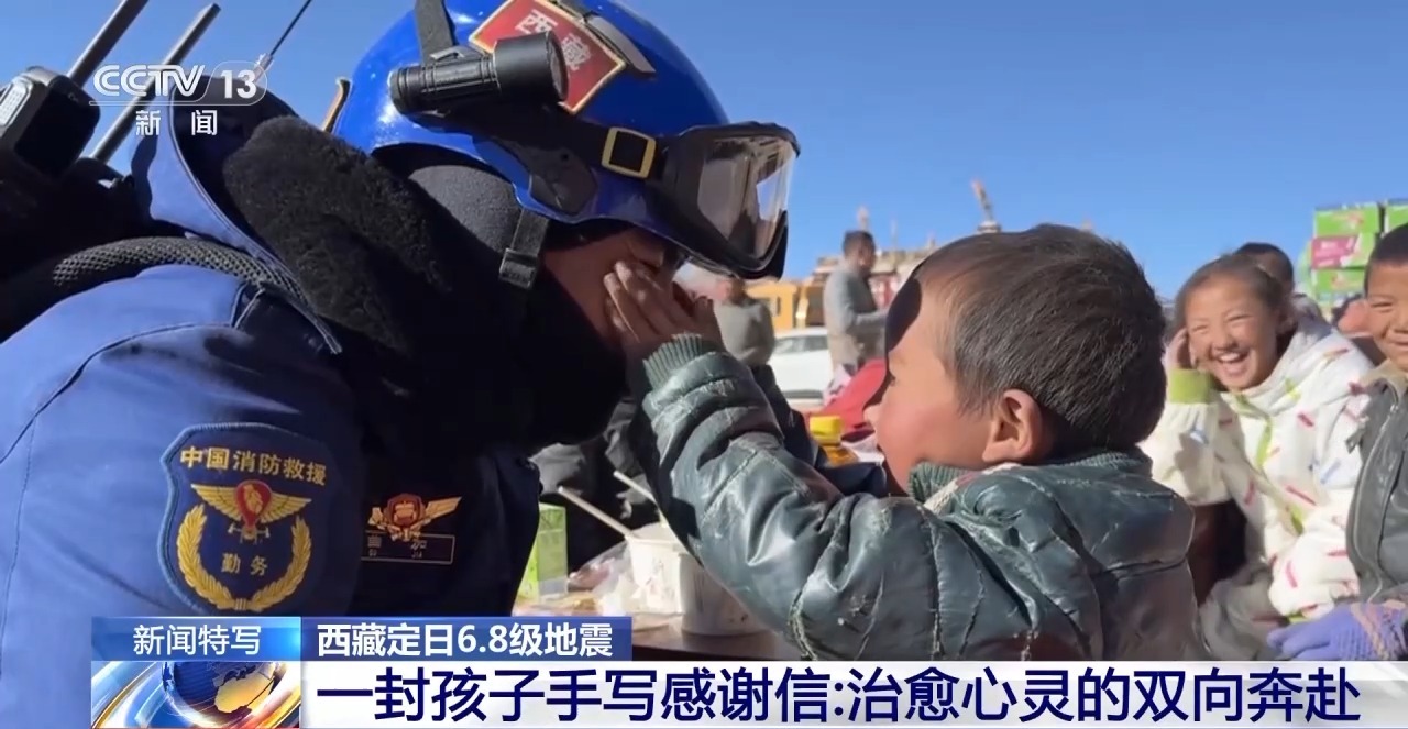 西藏森林消防總隊教育宣傳處助理員 鄭龍:能感覺到孩子在地震里受到的驚嚇正在慢慢減少,還會主動過去找消防員玩,主動“受領(lǐng)任務(wù)”,幫忙搬運物資。