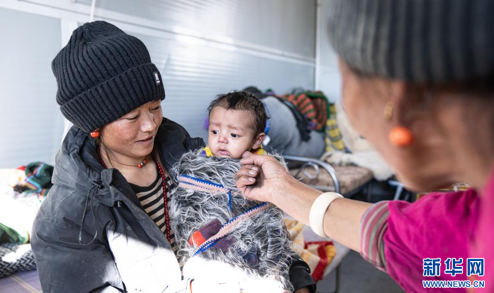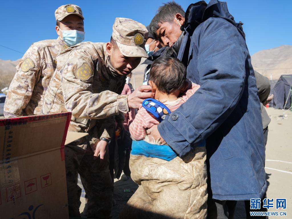 1月8日,在長(zhǎng)所鄉(xiāng)森嘎村臨時(shí)安置點(diǎn),西藏軍區(qū)總醫(yī)院醫(yī)療隊(duì)隊(duì)員為小朋友治療。 新華社記者 丁汀 攝