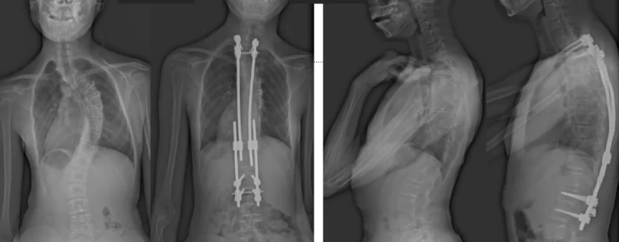白瑪今年10歲,正在讀小學。媽媽發(fā)現,白瑪經常歪著肩膀,在反復提醒“站直了,別歪著”后,情況也沒有改善。近半年來,白瑪的右側肩胛骨逐漸向后凸出。到醫(yī)院檢查后發(fā)現,白瑪的胸椎存在明顯的側凸畸形,是早發(fā)型特發(fā)性脊柱側凸。由于側凸較為嚴重,已經失去了支具治療的機會。小白瑪才10歲,隨著身體的不斷成長,她的脊柱會越來越彎,肩膀會越來傾斜。這不僅影響體態(tài)和外觀,也可能限制心、肺等內臟器官的發(fā)育,導致心肺功能下降、肢體活動不便,出現癱瘓,甚至死亡。對于白瑪這種情況,只能利用手術治療來矯正脊柱、阻止骨骼畸形進展。