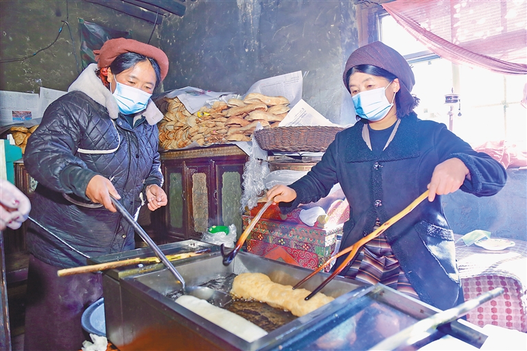 旦索朗一家,在每年藏歷新年前夕,都會(huì)開(kāi)啟一年中最為繁忙的時(shí)光——經(jīng)營(yíng)“卡賽”生意。旦索朗回憶往昔,感慨萬(wàn)千:“小時(shí)候過(guò)年,炸‘卡賽’是家家戶戶的頭等大事,整個(gè)村子都彌漫著誘人的香氣,那是新年專(zhuān)屬的味道。如今,時(shí)代在變遷,人們的生活方式也發(fā)生了改變,越來(lái)越多的人選擇購(gòu)買(mǎi)成品‘卡賽’,這既契合了快節(jié)奏的現(xiàn)代生活,也為我們提供了發(fā)展的機(jī)遇。我們經(jīng)營(yíng)‘卡賽’生意已有6年,這期間,靠著誠(chéng)信經(jīng)營(yíng)和對(duì)高品質(zhì)的堅(jiān)守,生意蒸蒸日上,還帶動(dòng)了6名村民共同增收,大家一起用雙手創(chuàng)造美好生活。”