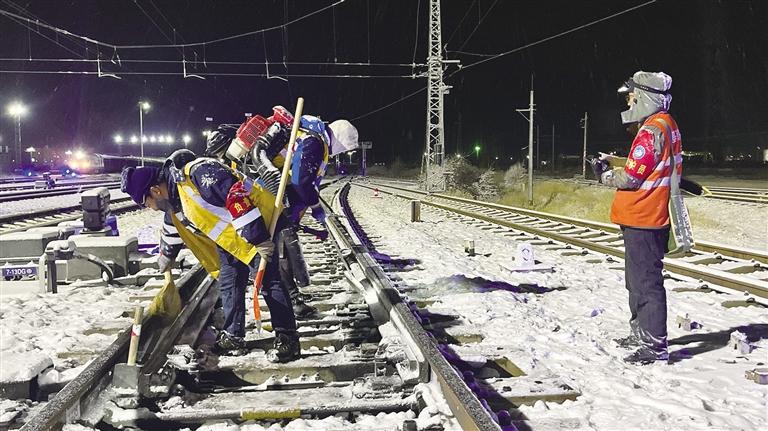 “掃雪時要注意腳下,防止滑倒……”到達拉薩西貨場1號道岔后,工長白登渠影帶領(lǐng)職工們按照分工,有序地使用掃把、除雪鏟、除雪鉤、吹雪機等工具,對道岔尖軌、滑床板、轉(zhuǎn)轍部位等關(guān)鍵位置的積雪進行清理。在紛紛揚揚的大雪中,大家踩雪發(fā)出的“嘎吱”聲、雪鏟除冰的敲擊聲交織在一起。