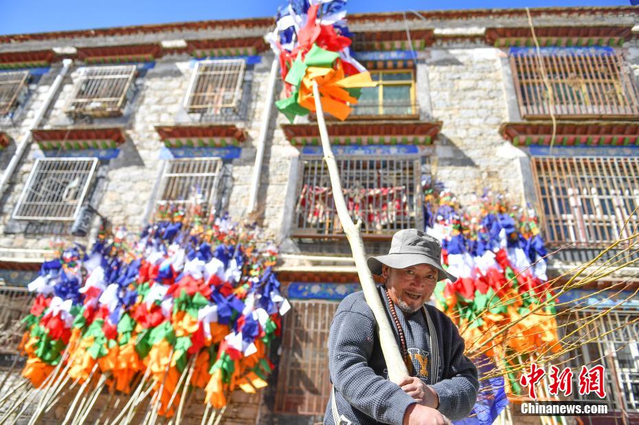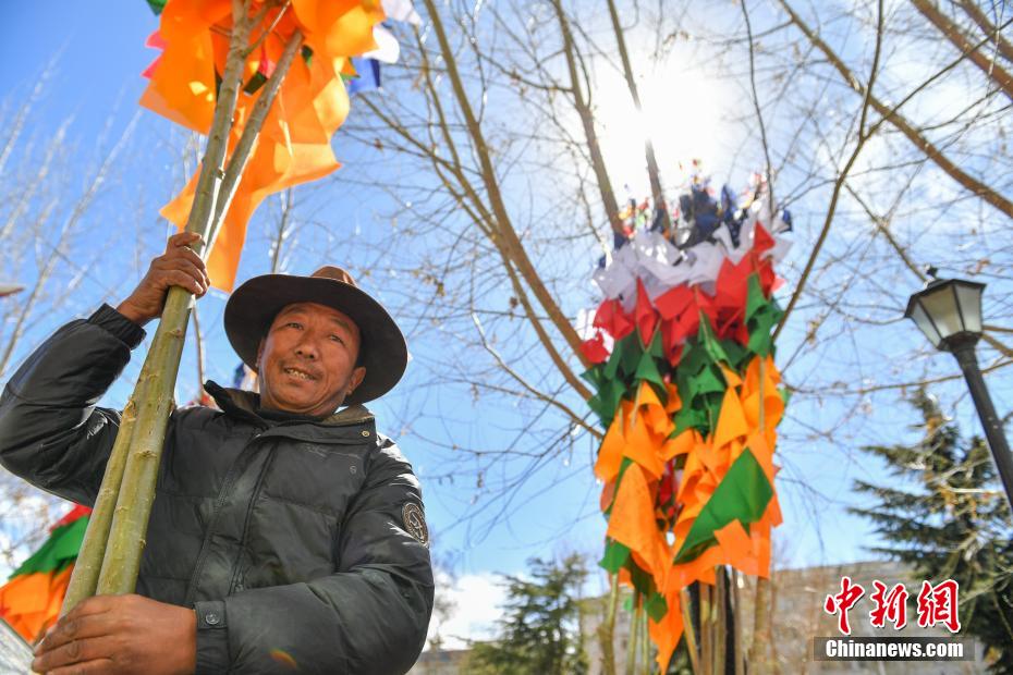 臨近藏歷新年,2月16日,在西藏拉薩街頭,農(nóng)牧民正縫制五彩經(jīng)幡樹。五彩經(jīng)幡樹是藏族民眾在藏歷新年前必備的年貨之一。藏歷新年期間,藏族民眾會選擇一個良辰吉日,為自家的房頂更換五彩經(jīng)幡樹,祈求新的一年里五谷豐登,吉祥如意。圖為2月16日,來自尼木縣的普瓊扛著五彩經(jīng)幡樹。貢確 攝