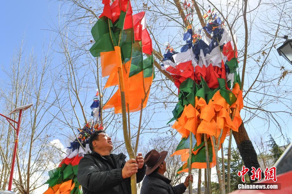 臨近藏歷新年,2月16日,在西藏拉薩街頭,農(nóng)牧民正縫制五彩經(jīng)幡樹。五彩經(jīng)幡樹是藏族民眾在藏歷新年前必備的年貨之一。藏歷新年期間,藏族民眾會選擇一個良辰吉日,為自家的房頂更換五彩經(jīng)幡樹,祈求新的一年里五谷豐登,吉祥如意。圖為2月16日,制作完成的五彩經(jīng)幡樹。貢確 攝