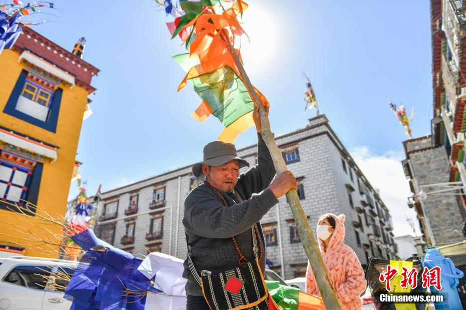 臨近藏歷新年,2月16日,在西藏拉薩街頭,農(nóng)牧民正縫制五彩經(jīng)幡樹。五彩經(jīng)幡樹是藏族民眾在藏歷新年前必備的年貨之一。藏歷新年期間,藏族民眾會選擇一個良辰吉日,為自家的房頂更換五彩經(jīng)幡樹,祈求新的一年里五谷豐登,吉祥如意。圖為2月16日,普瓊在給顧客展示五彩經(jīng)幡樹。貢確 攝