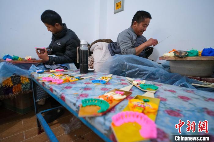 2月20日,來自日喀則仁布縣康雄鄉(xiāng)的次旺(右)和小兒子土旦桑布捏制酥油花?!≈行律缬浾?江飛波 攝