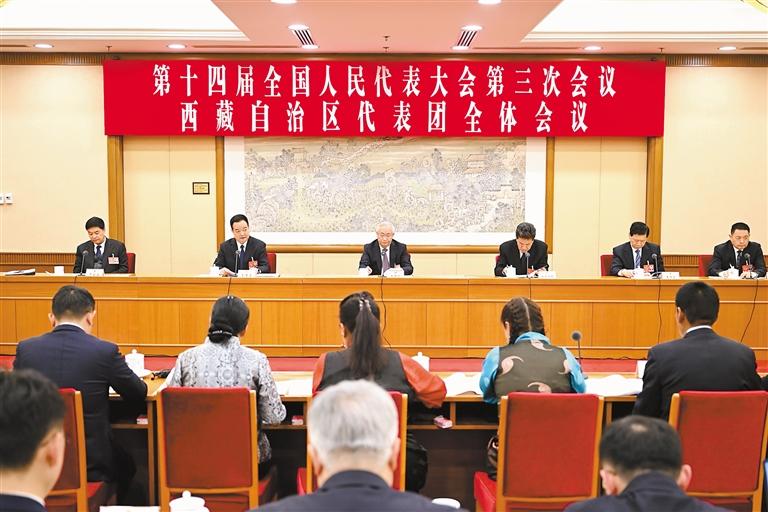 3月5日下午,十四屆全國(guó)人大三次會(huì)議西藏代表團(tuán)舉行全體會(huì)議,審議政府工作報(bào)告。