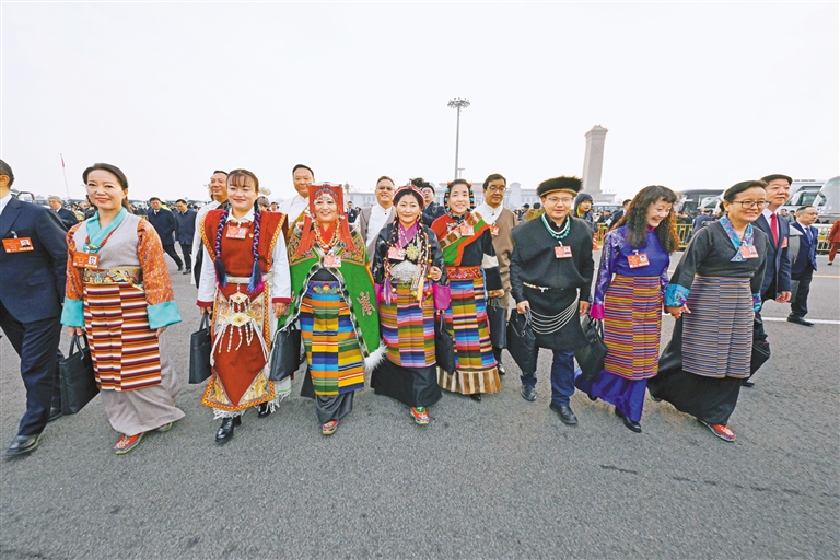 全國(guó)人大代表聆聽政府工作報(bào)告后,在人民大會(huì)堂前合影留念。記者 旦增西旦 攝
