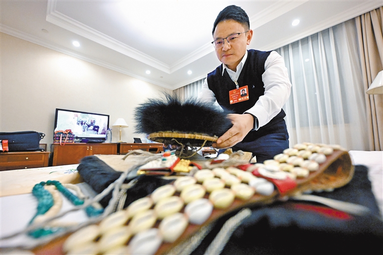 全國(guó)人大代表扎西江村在準(zhǔn)備參會(huì)時(shí)穿的民族服飾。