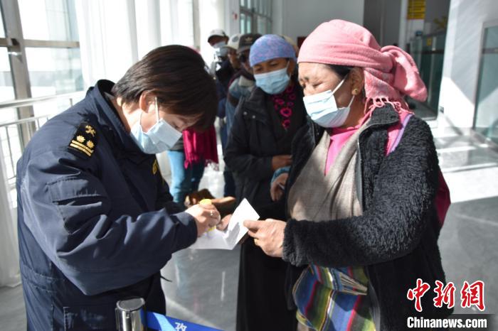 圖為日喀則海關(guān)里孜口岸女關(guān)員協(xié)助入境邊民粘貼入境識(shí)別碼。拉薩海關(guān)供圖