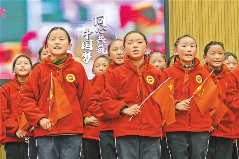 圖為3月5日,來自受災最嚴重的定日縣長所鄉(xiāng)、措果鄉(xiāng)、曲洛鄉(xiāng)的3所小學的學生在開學典禮上演唱歌曲《同心共筑中國夢》。新華社記者 姜帆 攝