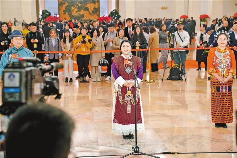 圖為住藏全國(guó)政協(xié)委員白瑪玉珍(中)在“委員通道”上介紹墨脫的發(fā)展變化。記者 旦增平措 次旦央吉 攝