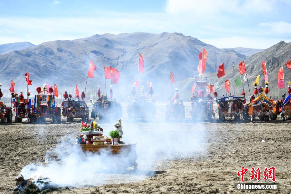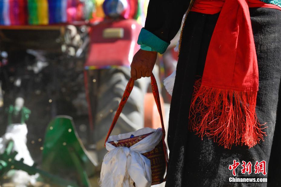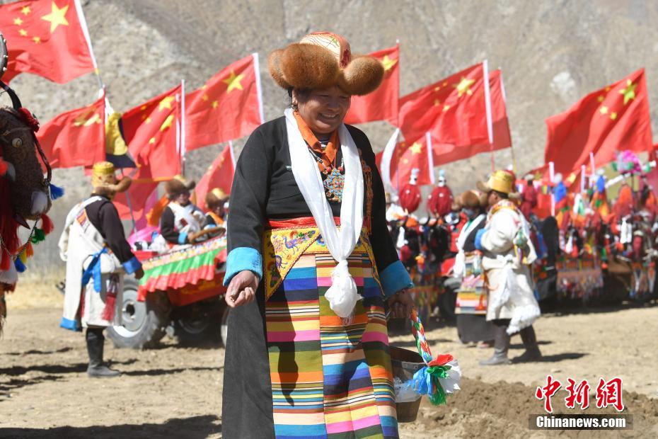 3月16日,西藏拉薩迎來一年一度的傳統(tǒng)春耕儀式。當日,拉薩市曲水縣色達村村民身著節(jié)日盛裝,相聚在田間,載歌載舞,共同迎接春耕第一犁。家家戶戶端著自家的“切瑪”(象征五谷豐登)帶著青稞酒、酥油茶等物品聚在田間,互敬青稞酒,開始撒種,祈求全年風調雨順、五谷豐登。圖為曲水縣色達村春耕儀式現(xiàn)場,當?shù)孛癖姳硌菸璧浮栋⒓诎汀贰?span>中新社記者 貢嘎來松 攝