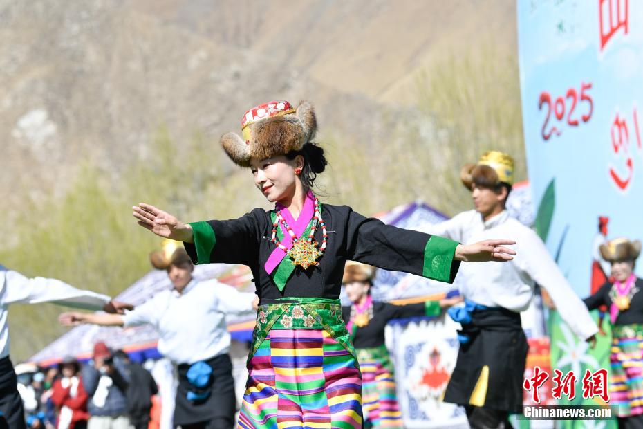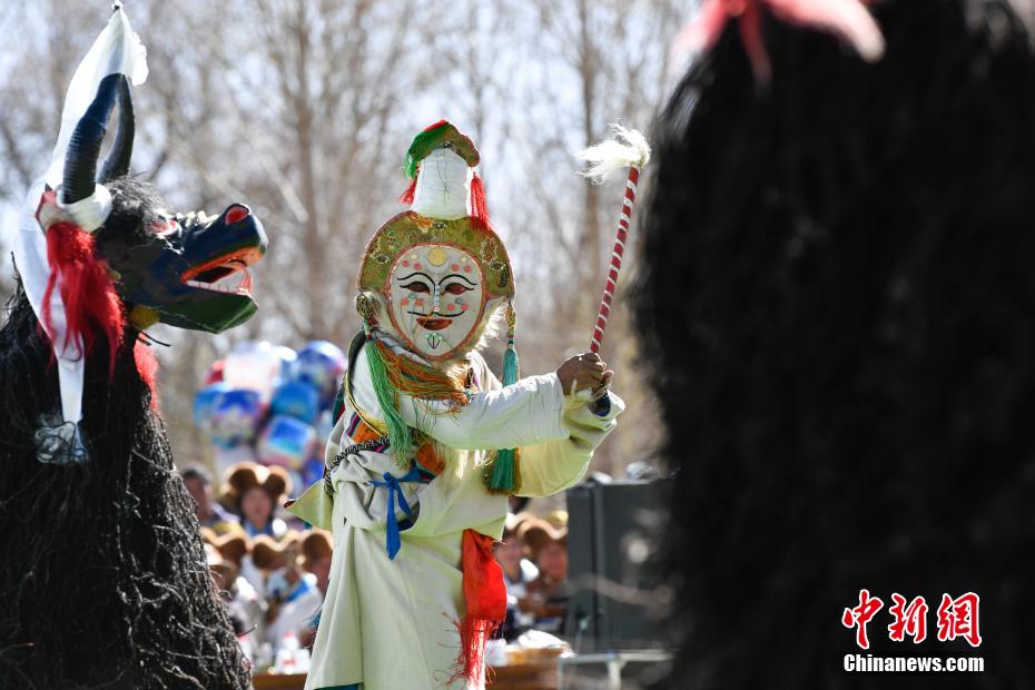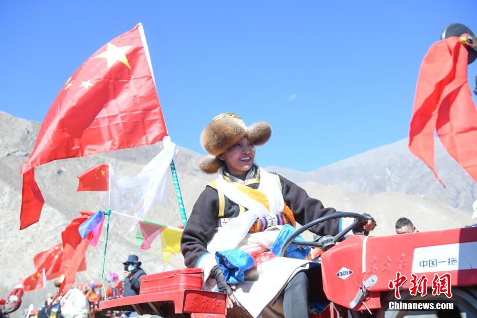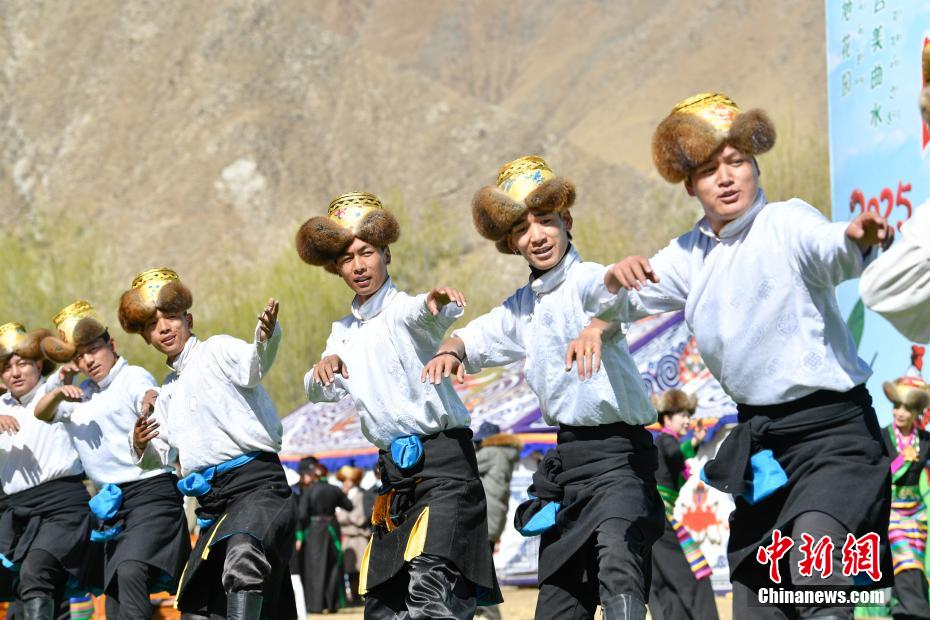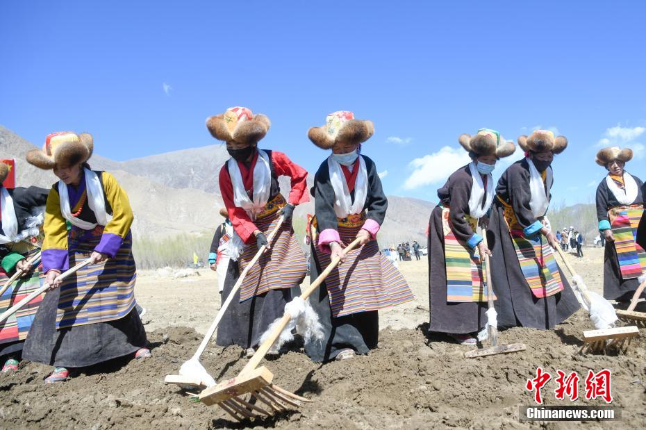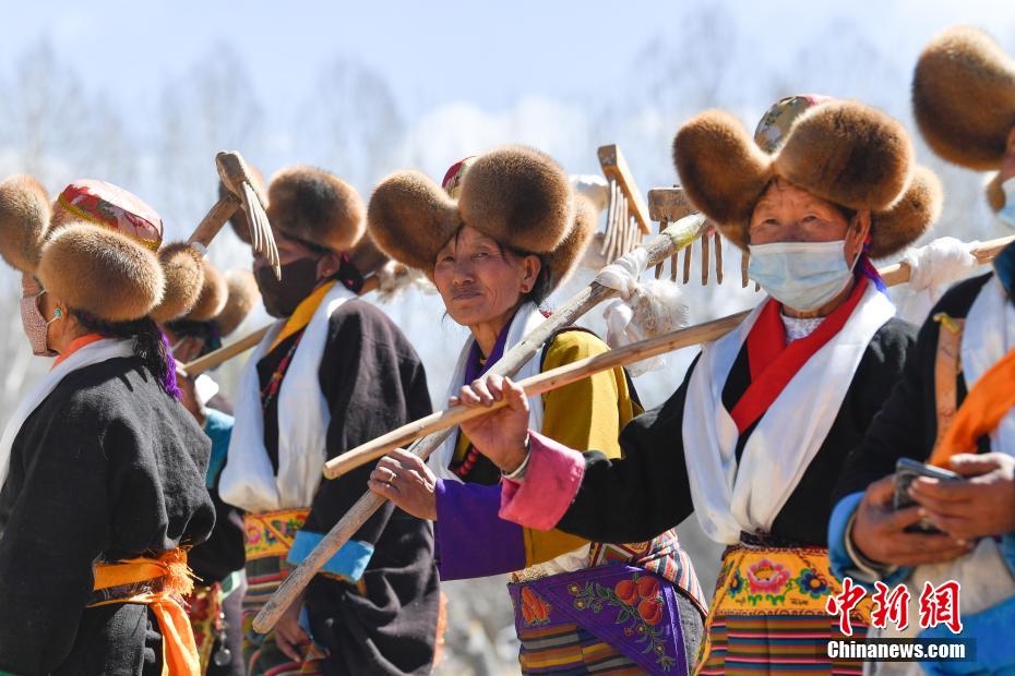 3月16日,西藏拉薩迎來一年一度的傳統(tǒng)春耕儀式。當日,拉薩市曲水縣色達村村民身著節(jié)日盛裝,相聚在田間,載歌載舞,共同迎接春耕第一犁。家家戶戶端著自家的“切瑪”(象征五谷豐登)帶著青稞酒、酥油茶等物品聚在田間,互敬青稞酒,開始撒種,祈求全年風調雨順、五谷豐登。圖為曲水縣色達村春耕儀式現(xiàn)場,當?shù)孛癖姳硌輫壹壏俏镔|文化遺產(chǎn)《吉祥仲孜》。中新社記者 貢嘎來松 攝