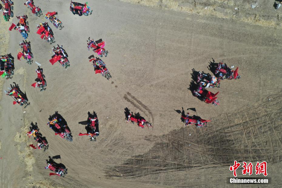 3月16日,西藏拉薩迎來一年一度的傳統(tǒng)春耕儀式。當日,拉薩市曲水縣色達村村民身著節(jié)日盛裝,相聚在田間,載歌載舞,共同迎接春耕第一犁。家家戶戶端著自家的“切瑪”(象征五谷豐登)帶著青稞酒、酥油茶等物品聚在田間,互敬青稞酒,開始撒種,祈求全年風調雨順、五谷豐登。圖為曲水縣色達村春耕儀式現(xiàn)場(無人機照片)。中新社記者 貢嘎來松 攝