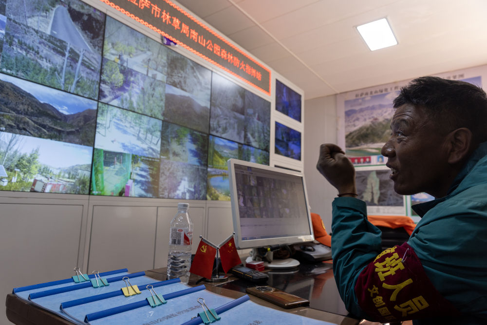 拉薩南山公園園區(qū)護林員扎西曲培正在監(jiān)控室觀察園區(qū)各處情況(3月20日攝)。新華社記者姜帆 攝