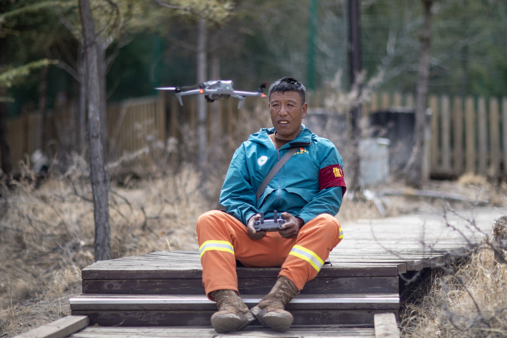 拉薩南山公園園區(qū)護林員扎西曲培正在操控無人機(3月20日攝)。新華社記者姜帆 攝