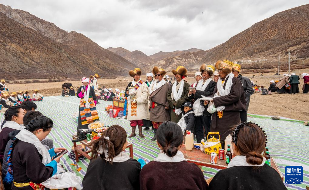 旺慶老人(右)在春耕大典上為客人敬酒獻(xiàn)唱(3月16日攝)。新華社記者 晉美多吉 攝