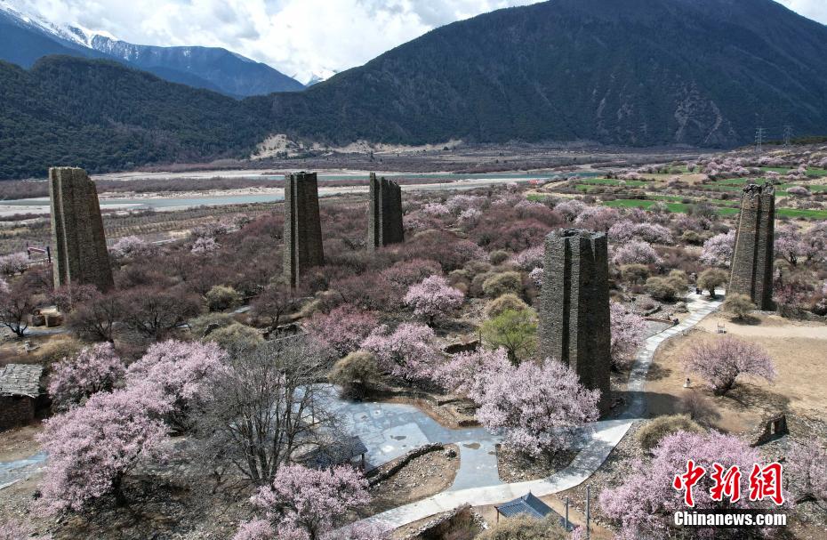 秀巴古堡位于西藏林芝市工布江達縣,是古代的軍事設施,距今已有1600多年的歷史。時下,古堡之下遍布的桃花競相綻放,粉白桃花點綴著滄桑古堡,景色壯麗。圖為4月5日,秀巴古堡群下桃花綻放。(無人機照片)中新社記者 李林 攝
