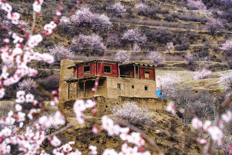 三月的最后一天清晨9時,“走進昌都 約會春天”采風團一行驅(qū)車前往隱匿于貢覺縣莫洛鎮(zhèn)的達律王府。這座始建于吐蕃時期的宮殿,因未對外開放,我們幸得當?shù)匚穆貌块T協(xié)助,聯(lián)系到女主人桑杰拉姆,方得以踏入這座占地400平方米的藏式建筑瑰寶。