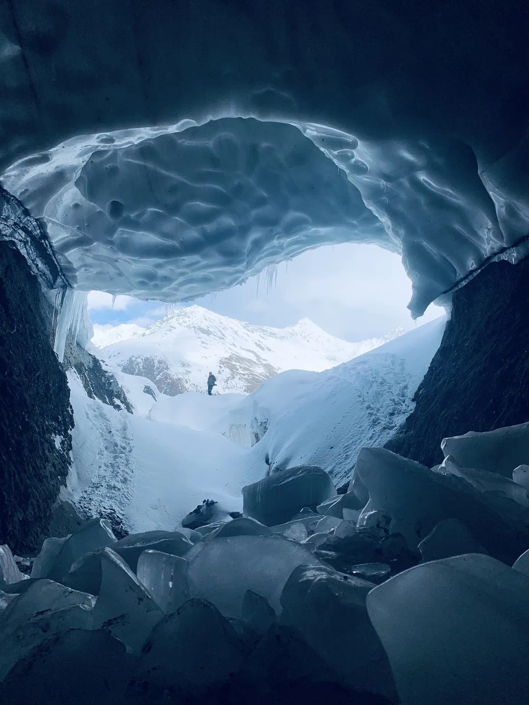 冰洞入口高約1米,需要彎著腰才能進入。待完全進入后,空間逐漸開闊,冰洞內別有洞天。冰壁深處透著蔚藍,似是把邊壩的藍天鎖了進去。冰洞最開闊的地方有一處冰臺,游客在那里打卡拍照,記錄下這絕美的風光。