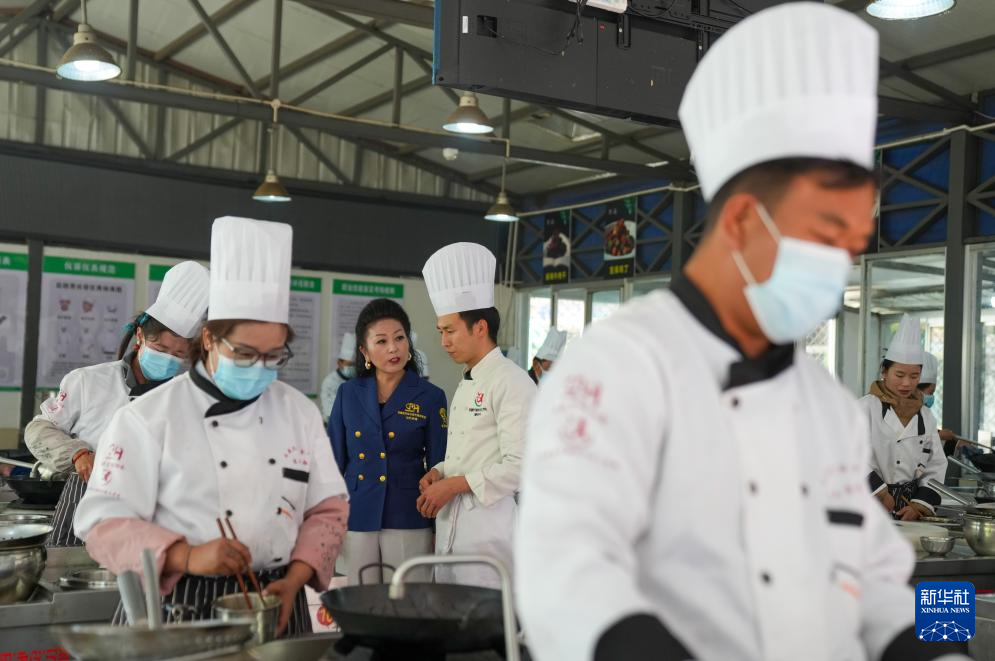 邊巴卓噶在烹飪技能班和老師交流學(xué)員學(xué)習(xí)情況(4月23日攝)。新華社記者 晉美多吉 攝