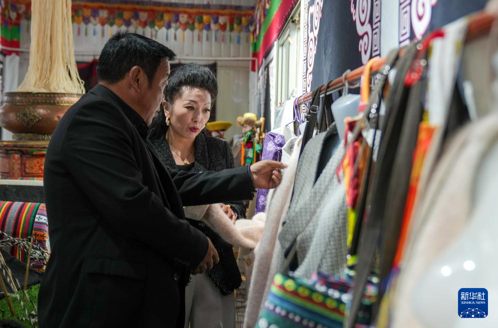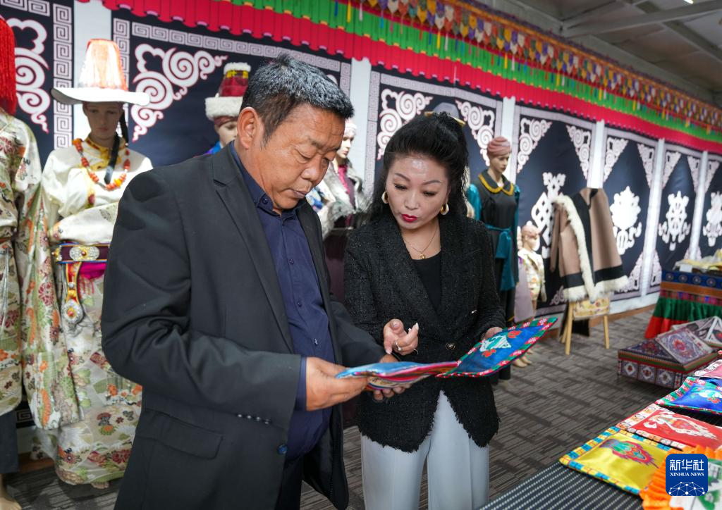 邊巴卓噶(右)和副校長普布次仁在查看縫紉班學(xué)員制作的布藝作品(4月23日攝)。新華社記者 晉美多吉 攝