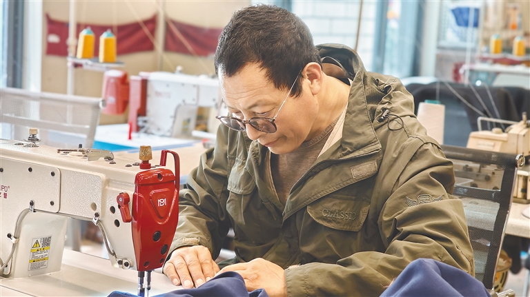 圖為自治區(qū)級非遺傳承人、雪堆白技工學校噠啦服飾工作室老師洛桑麥朗在制作藏裝。