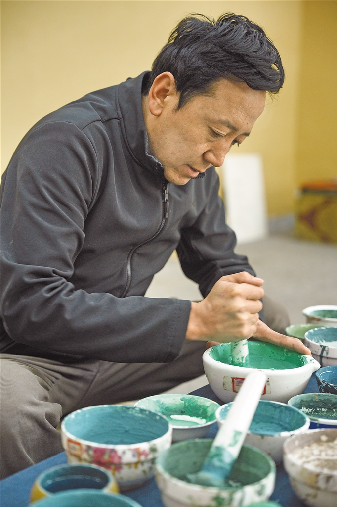 圖為唐卡(齊吾崗派)自治區(qū)級非遺傳承人、雪堆白唐卡畫院副院長巴桑次仁在調(diào)配唐卡顏料。