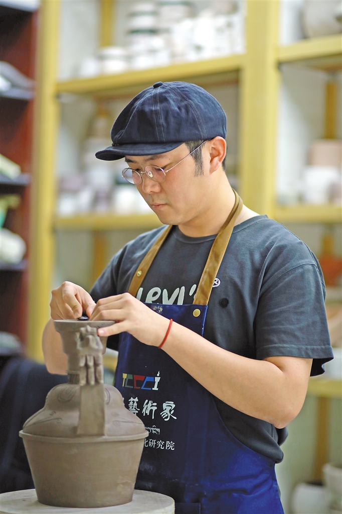 圖為雪堆白技工學校陶瓷工作室老師王竹在進行藏式器皿的設計與制作。