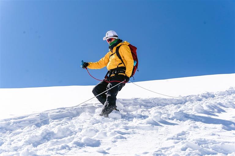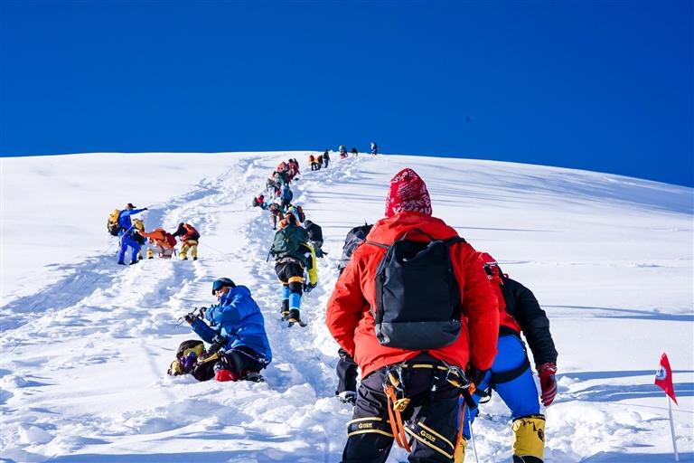 登頂?shù)哪且豢?,喜悅之情洋溢在每個(gè)人的臉上,大家紛紛開始拍照留念。第三次登頂?shù)纳接鸭?,難掩激動(dòng)地向記者分享了此次難忘的攀登經(jīng)歷。她提到,在沖頂前一日,教練提醒所有人,因近期頻繁降雪,加之粉雪的特性,今年的攀登路線難度大幅提升。盡管如此,這絲毫沒有削減她的熱情,反而讓她對(duì)3日的登頂充滿了期待。