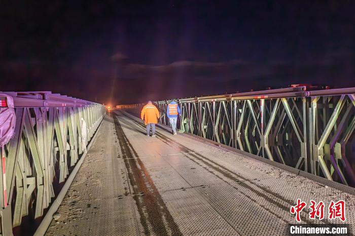 圖為5月12日凌晨地震后,養(yǎng)護(hù)人員對拉孜雅魯藏布江臨時(shí)保通鋼架橋進(jìn)行檢查。西藏自治區(qū)交通運(yùn)輸廳 供圖