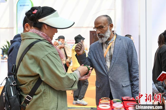 圖為拉薩進(jìn)口商品展覽會(huì)現(xiàn)場,巴基斯坦商人(右)向顧客介紹、推銷手鐲。中新社記者 貢嘎來松 攝
