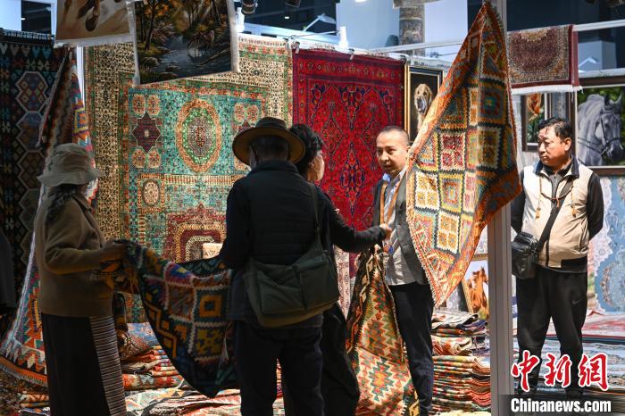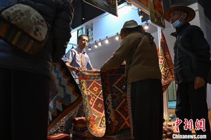 圖為拉薩進(jìn)口商品展覽會(huì)現(xiàn)場,伊朗商人(左)向顧客介紹、推銷毛毯。中新社記者 貢嘎來松 攝