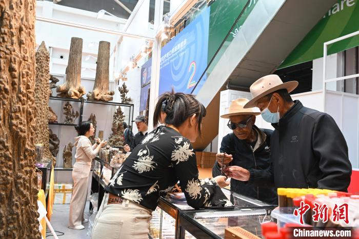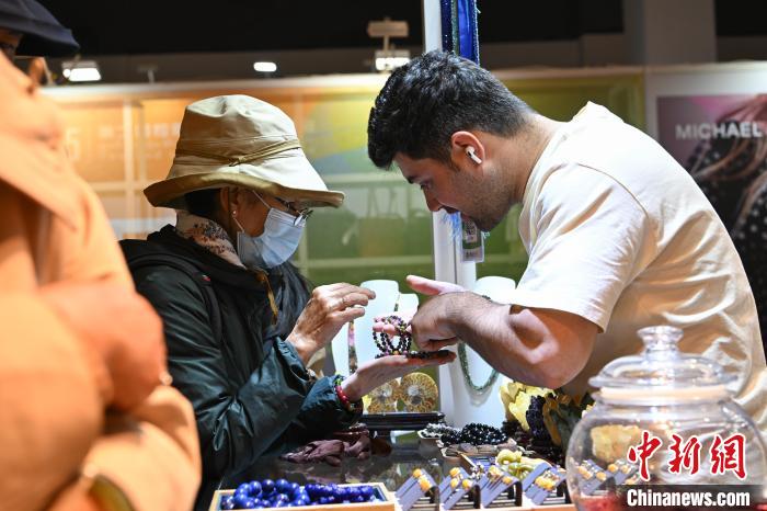 5月16日,2025第二屆拉薩進(jìn)口商品展覽會(huì)在西藏會(huì)展中心2號(hào)館舉行。該展會(huì)以“開放新拉薩,共享新機(jī)遇”為主題,吸引了來自30多個(gè)國家和250多家企業(yè)參展,客商總數(shù)為600多人,其中境外及港澳臺(tái)地區(qū)人員達(dá)200多人。本屆展會(huì)上,展商們帶來了超 1500個(gè)品類、10000余款展品。圖為拉薩進(jìn)口商品展覽會(huì)現(xiàn)場,巴基斯坦商人(右)向顧客介紹、推銷自己的商品。中新社記者 貢嘎來松 攝