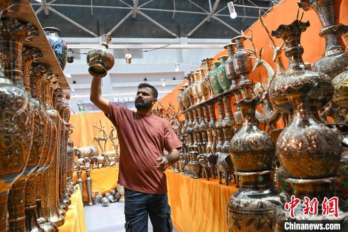 圖為拉薩進(jìn)口商品展覽會(huì)現(xiàn)場,巴基斯坦商人在展會(huì)上擺放商品。中新社記者 貢嘎來松 攝