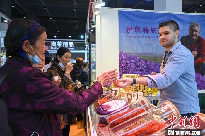 圖為拉薩進(jìn)口商品展覽會(huì)現(xiàn)場,伊朗商人(右)向顧客品嘗藏紅花。中新社記者 貢嘎來松 攝